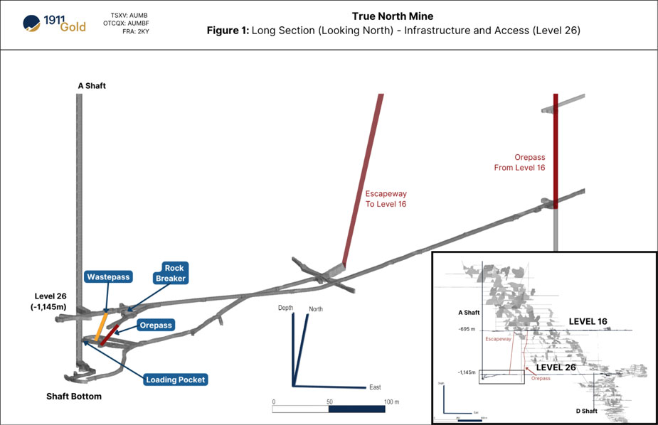 Vancouver, BC, April 16, 2026 – 1911 Gold Corporation ("1911 Gold" or the "Company") (TSXV: AUMB; OTCQX: AUMBF; FRA: 2KY), an advanced gold exploration and development company advancing the fully built and permitted True North Gold Project (“True North”) towards production in 2027, is pleased to announce that the dewatering program at the True North mine has reached approximately 4 metres below Level 26, allowing the Company to commence rehabilitation work on the level. Dewatering to the shaft bottom (including the loading pocket) is expected to be completed before the end of May. Following the completion of rehabilitation work on Level 26, the Company will be able to advance the diamond drilling program in the high-grade 710-711 zone, as well as commence development work necessary for production next year.