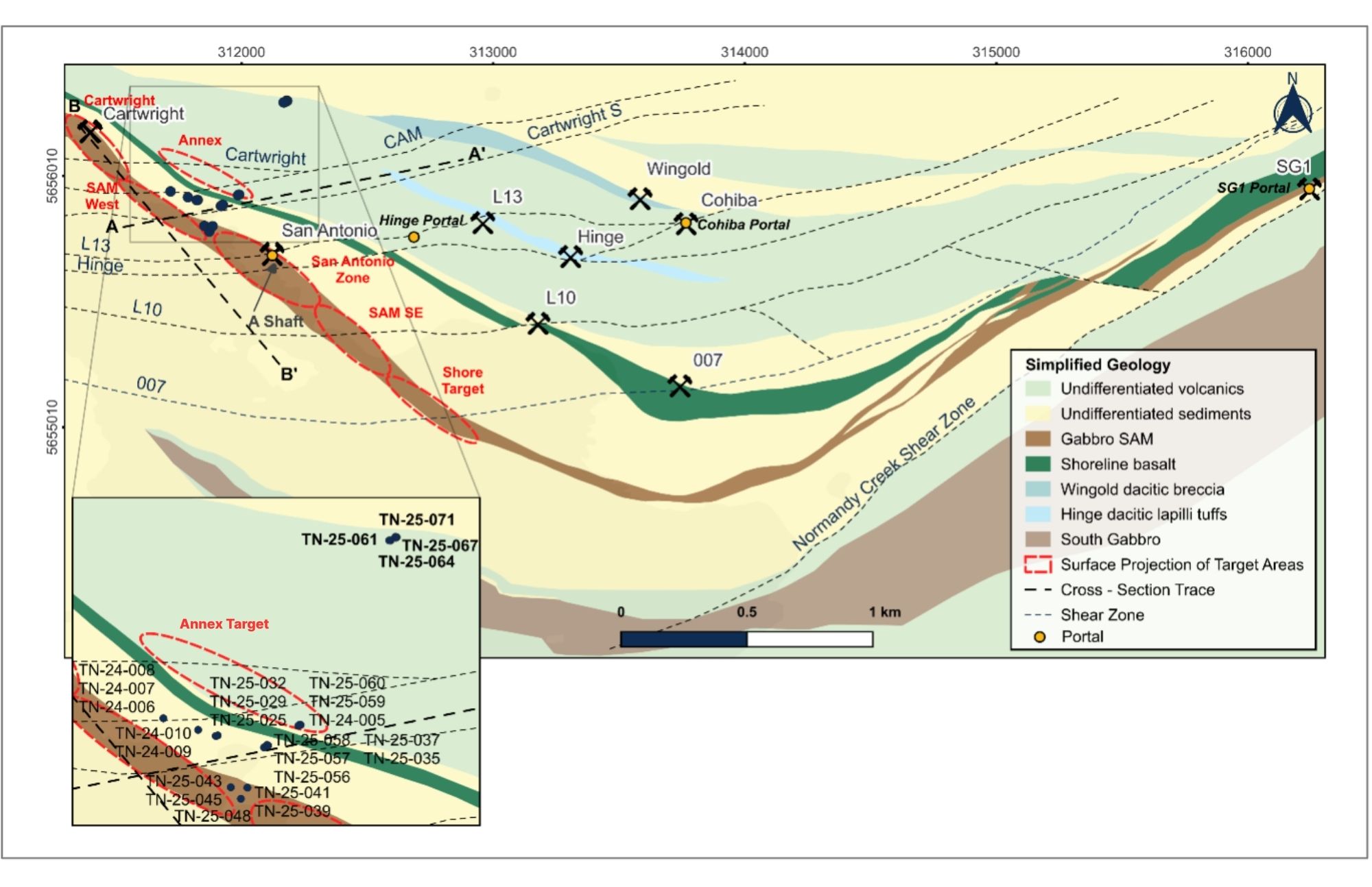 - TN-25-061: Intersected 10.00 g/t Au over 0.50 m (at 247.80 m) and 8.75 g/t Au over 2.60 m (at 294.00 m), including 18.00 g/t Au over 1.00 m