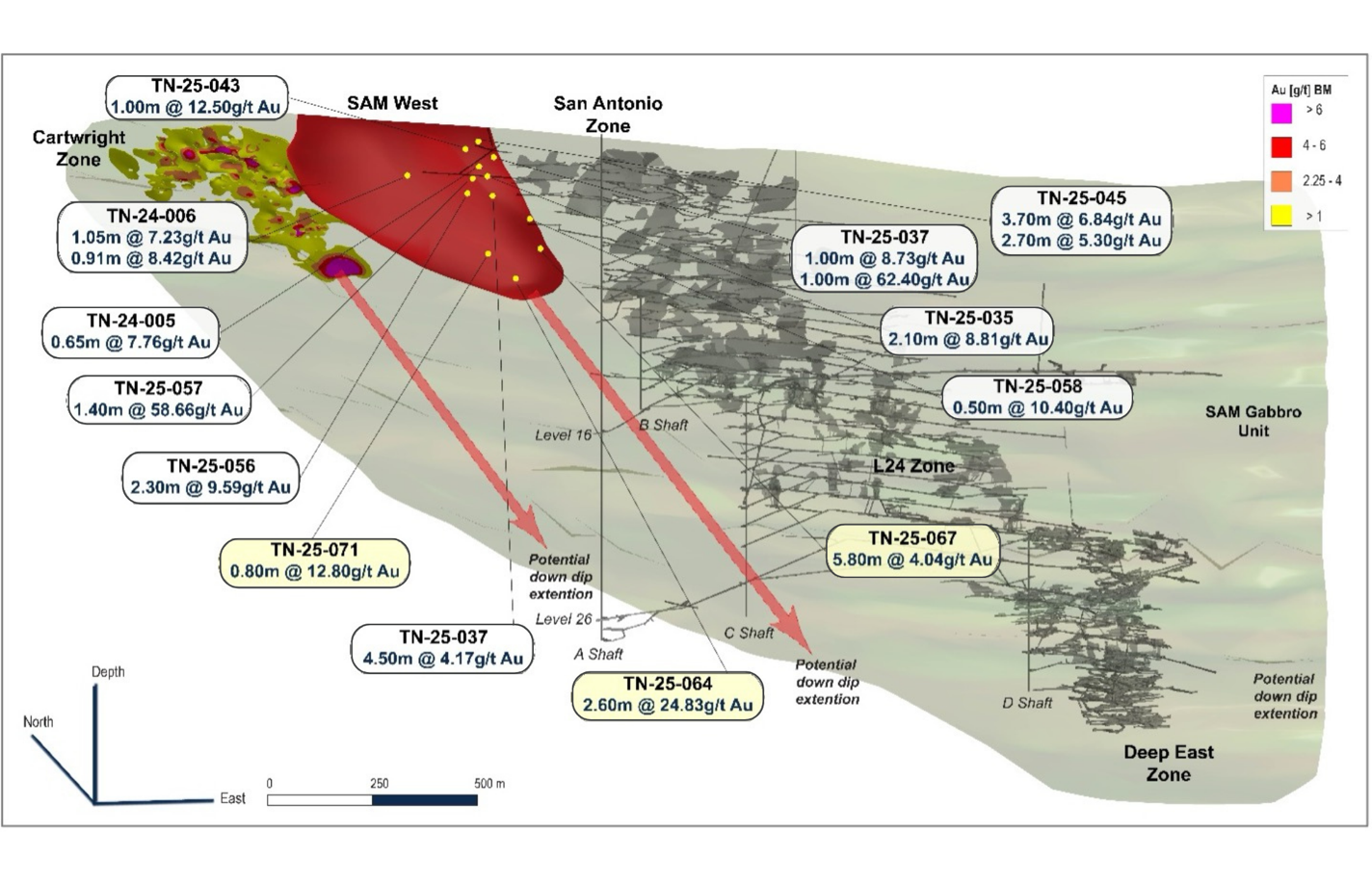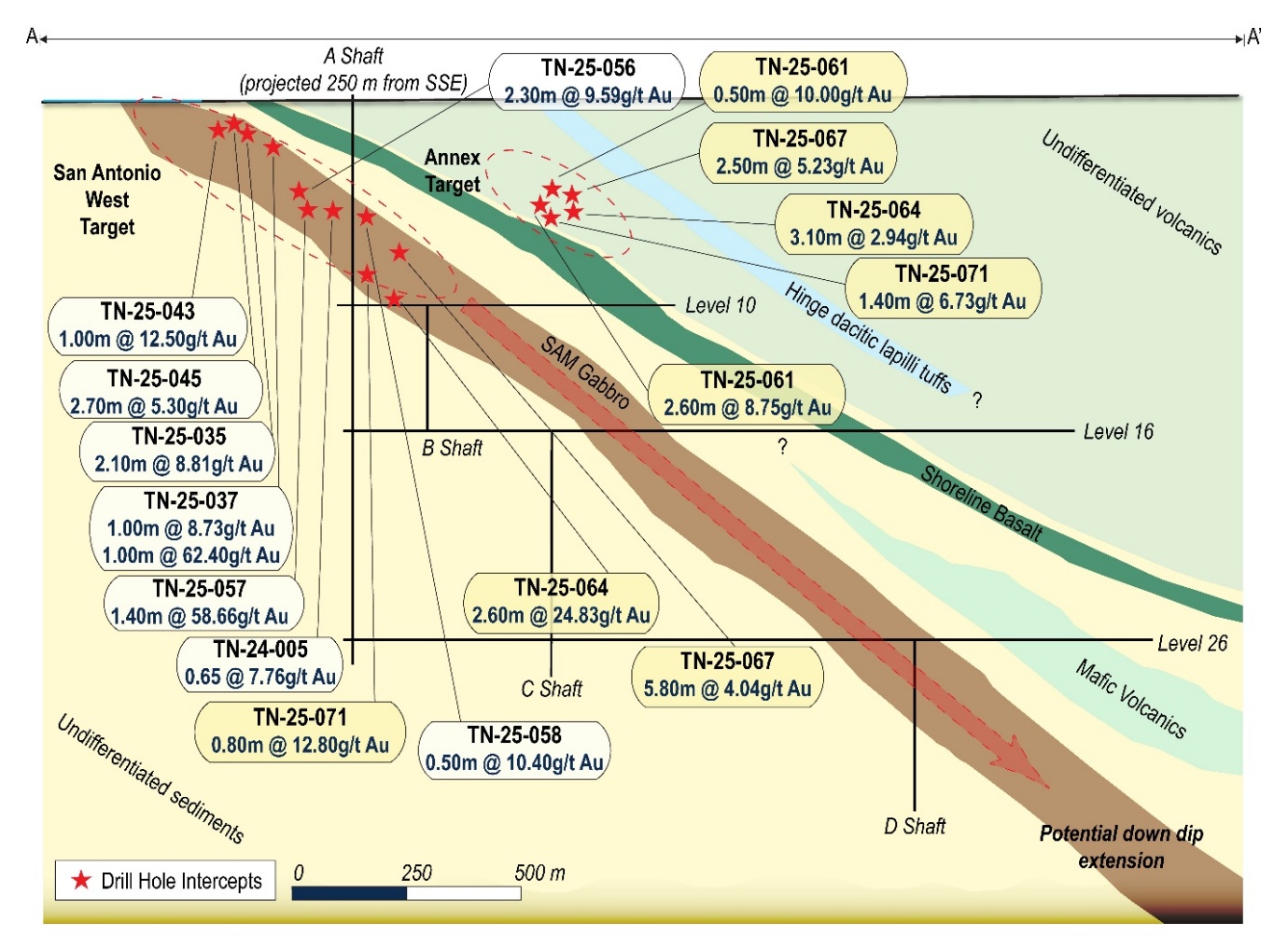 - TN-25-064: Intersected 24.83 grams per tonne (“g/t”) Au over 2.60 m (at 490.00 m), including 46.00 g/t Au over 1.00 m, including 63.20 g/t Au over 0.50 m, 28.80 g/t Au over 0.50 m and 32.40 g/t Au over 0.50 m
