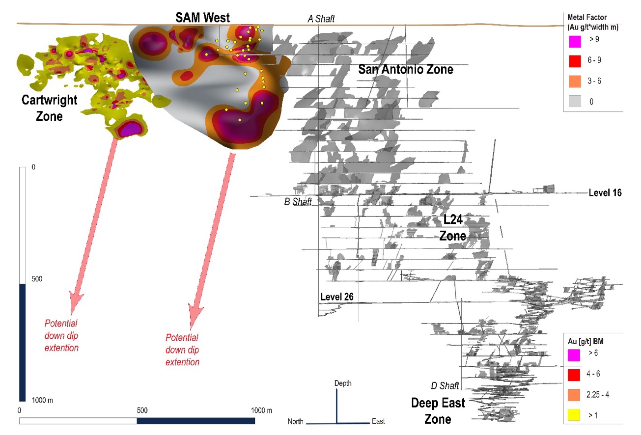 *Along the Cartwright South shear zone projected to vertical, San Antonio drifts and shafts projected up to 250 m from the south-east